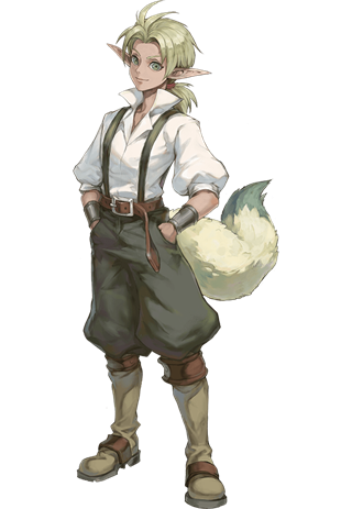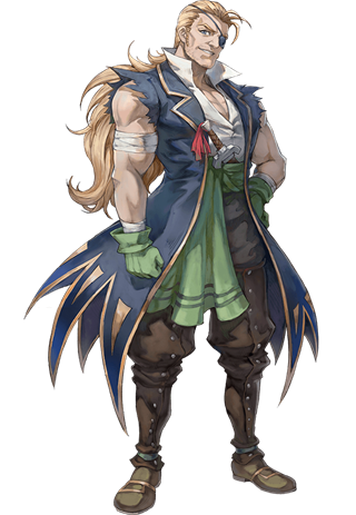 拥有一头鲜艳红发的冒险家青年。与多吉一同在沿海地区旅行时,因被卷入泰拉一行人的事件面登上海盗船,最终决定前往”卡南大旋涡”。出海进入阿特拉斯海一周后,海盗船遭到罗门舰队炮击时,为了保护特拉而从海盗船上跌落,被“大旋涡”吞噬。