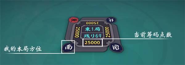 6、【25000】是我们当前的筹码点数,每局比赛结束将以筹码点数进行支付。最终排名也是以筹码点数为依据,点数越高排名越高。【南】代表你本局方位,也是我们本局的自风。