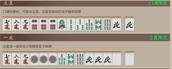 13、日本麻将最具有代表性的【役·立直】来啦~!没有吃、碰、明杠的情况下,听牌时可宣告立直,立直后就只能打出摸的牌了哟。满足和牌牌型的同时,又已经宣告了立直,那么就可以和牌了。