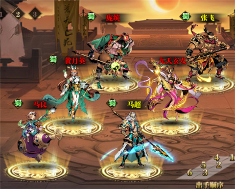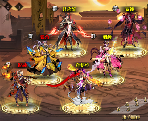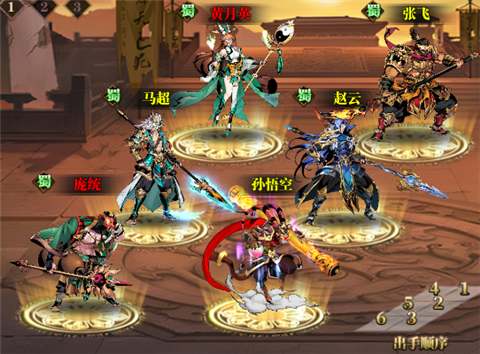 1号位张飞前列减怒+减攻,降低敌方前列威胁并且提升全体友军伤害加成;赵云2号位高机动性+大量回怒,并且配合张飞提升全体伤害;3号位孙悟空状态拉满,收割横排并大量提升自身伤害,为下回合收割第一横排做准备;4号位黄月英抬一手,保证5,6号位的存活的情况并回复友军怒气;5号位马超高额单体伤害带回怒气。