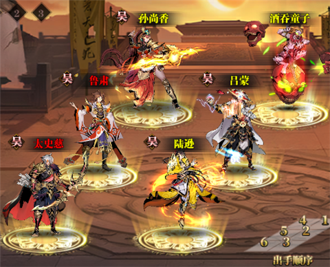 1号位酒吞童子控制全场;吕蒙2号位对前列高额伤害加眩晕并大幅度提高全体友军伤害加成和伤害减免;3号位陆逊全体伤害+灼烧,并且配合吕蒙进一步提高全队生存能力;4孙尚香后列伤害+灼烧,同时削弱目标敌人的减伤能力;5,6号位连续补充灼烧效果。