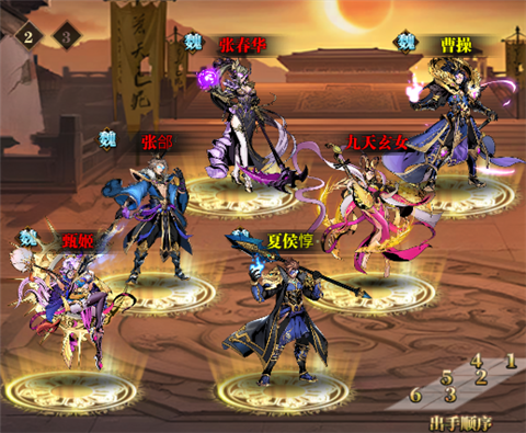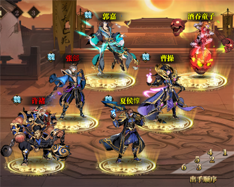 1号位曹操先手,控制+减怒收益最大化;2号位九天玄女补充十字伤害,配合曹操双减怒造成敌方怒气缺口;夏侯惇3号位对位高额伤害加眩晕后手6号位荀或同行补充控制及伤;4号甄姬抬一手,保证5,6号位的存活;5号位张郃攻击眩晕收益最大化。