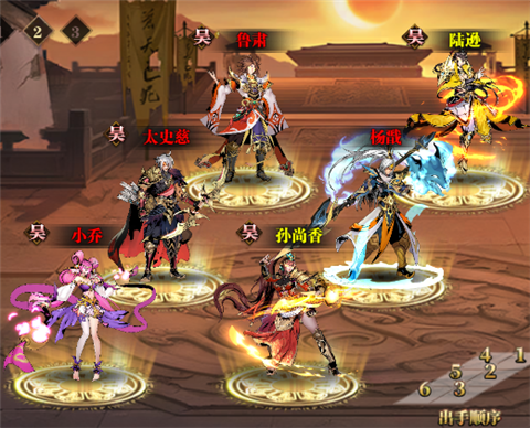 1号位陆逊全体伤害+灼烧,并大幅度提高全体友军伤害减免;2号位杨戬孙尚香后列伤害+灼烧,配合技能额外伤害效果削弱敌方血量;3号位孙尚香后列伤害+灼烧,同时削弱目标敌人的减伤能力;4,5号位连续补充灼烧效果和减怒效果;6号位大乔保证全体友军血量。