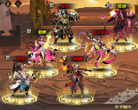 1号位贾诩随机高概率沉默,取得先手控制权;2号位九天玄女补充十字伤害,减怒造成敌方怒气缺口;3号位祝融前列爆发并进一步减少敌方怒气;4号位文丑横排爆发,大幅削弱敌方血量;5号位貂蝉十字伤害爆发收割战场,并大幅度提高全体友军伤害输出能力;6号位华佗保持全体血量。