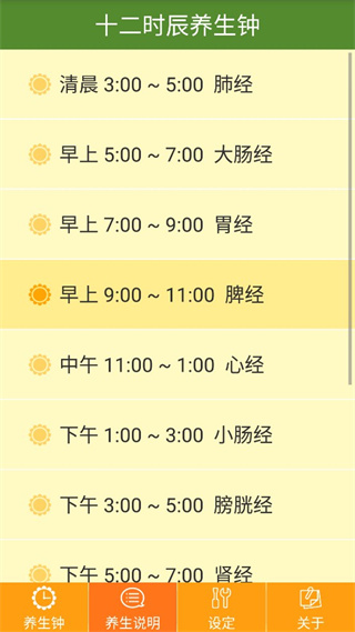 例如下午1点至3点的时段是属于小肠经的时间,本软件将会提醒您这个时段适合泡杯茶多喝水以利排毒,更要切忌在这个时段憋尿,会影响健康。