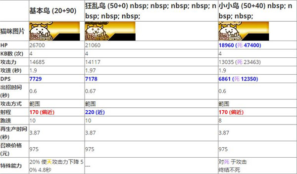 1、整体数值就是基本牛猫的下位替换版本,但由于基本牛猫的出场率不高,所以...咳咳...毕竟大狂乱牛的範围攻击+66跑速实在太香,除了联组功能或速攻,没人会用基本牛...