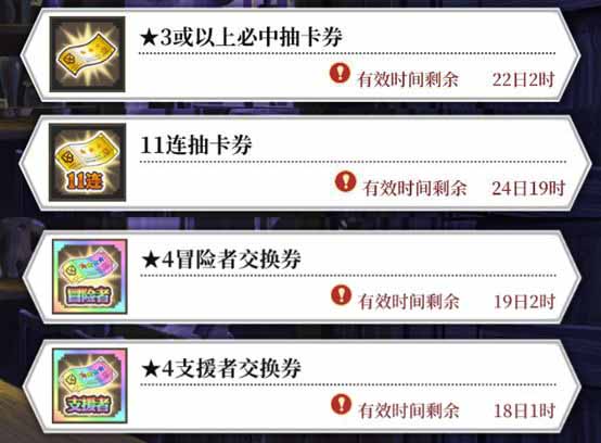 单抽包含:2星、3星、4星单抽券;11连包含:2星、3星、4星11连抽卡券;交换券:冒险者交换券、支援者交换券(稀有道具)