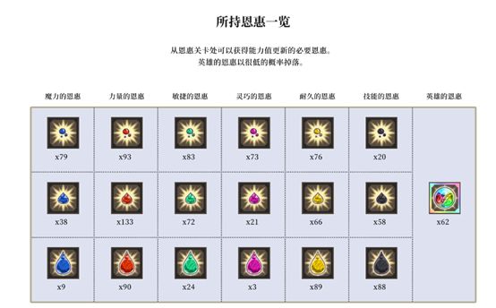 在刷恩惠关卡时会有一定概率掉落英雄恩惠,恩惠关卡可以使用英雄恩惠钥匙来提高恩惠关卡掉落英雄恩惠的获得率,适用于所有难度,每周星期二可以获得一个