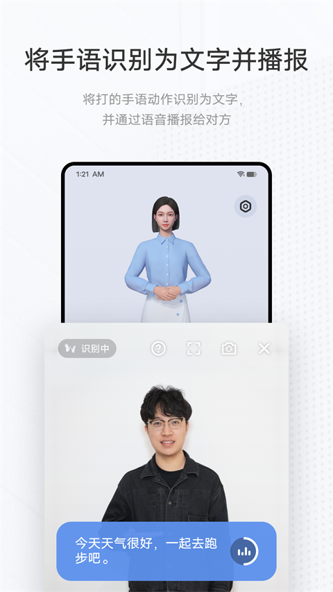 2、能够将语音实时转换成精准的手语和文字,通过两种语言获取信息,让交流沟通没有任何压力。