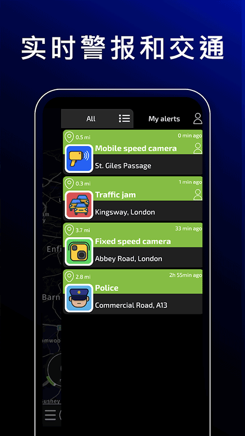 立即了解实时路况,避免交通堵塞、危险、事故、移动式车速摄像头、警察、直升机、无人机等等。