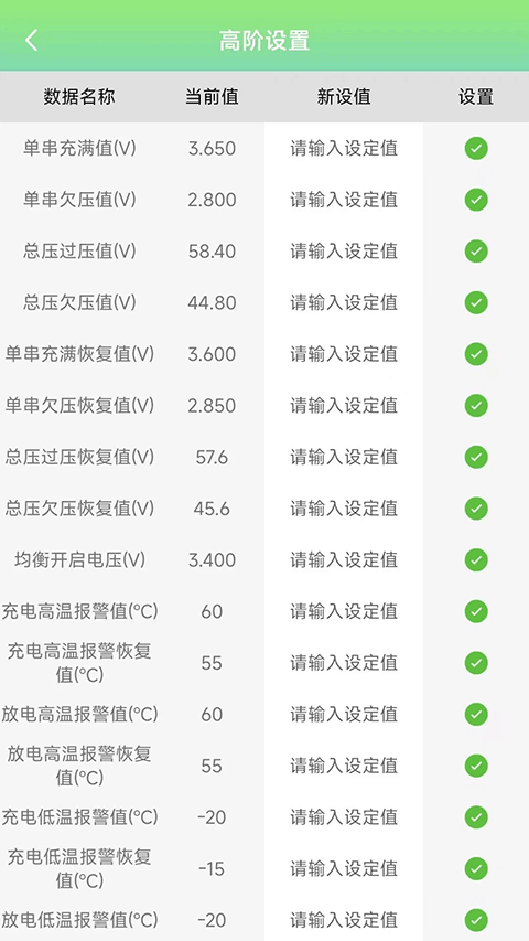 按应用场景的不同可以对电池类型、串数以及电压、电流的各项报警值进行修改;