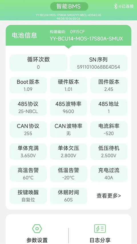 随时随地打开APP连接上电池即可看到各项详细数据信息,如电压、电流、温度、容量、SOC等;