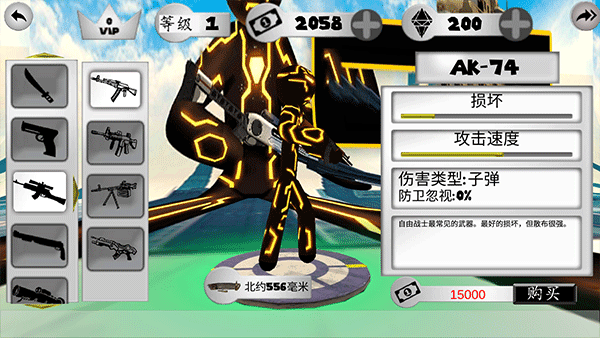 2、点击画面右上角的黄色“购物篮”可任意选择或购买枪械。