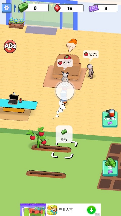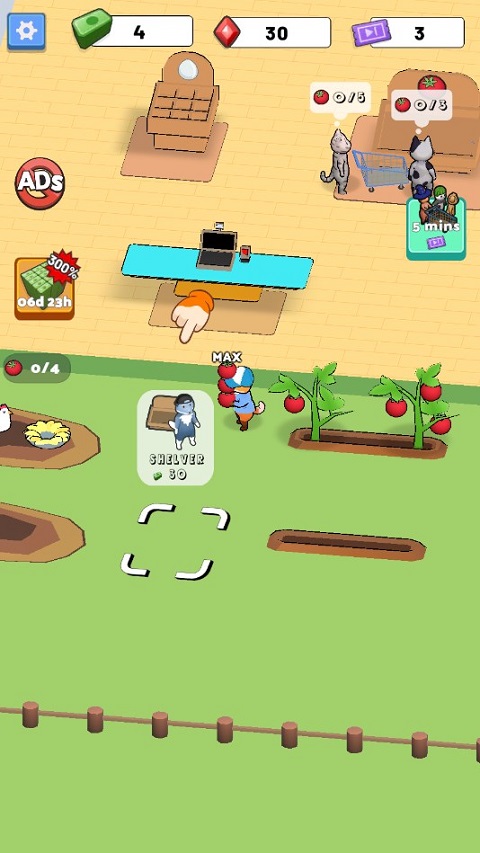 3、在这里玩家需打造完整的市场体系,利用前期建造的收银台、货架以及农田,开始出售种植的蔬菜水果。