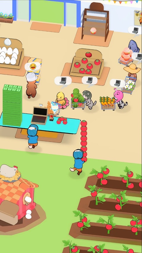 游戏中有很多农副产品可以种植,生长周期越长的作物价格越高。你需要不断搬运、种植和结账,积累资金来扩展市场。游戏里还有各种可爱的动物顾客,他们会根据自己的需求购买东西。完成任务还能解锁不同风格的新服饰和装饰,让市场看起来更吸引人。
