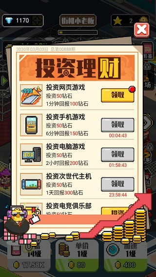 ①首先,整体游戏的升级选项非常的多,普通升级一共有三种,第一种是玩家通过升级场景中的电玩机的数量。第二种则是玩家需要升级电玩机每次使用时的单价,第三种则是玩家升级电玩机每次使用的时间,不过第三个我不太推荐强制升级,这个升级作用不是很大,玩家只需要点击屏幕加快当前的时间就可以结束这个问题。然后科金升级主要是潮牛的各种装饰,这个需要玩家用钻石来买,不过这个钻石他通过看广告场景,各种各样的广告掉落以及一些任务。剧情都可以直接进行获得,而且你可以通过投资钻石来进行利滚利。这个形成循环其实问题不大,所以说对玩家来说,钻石和金币相比而言也就是稍微拿获得的一个货币而已。