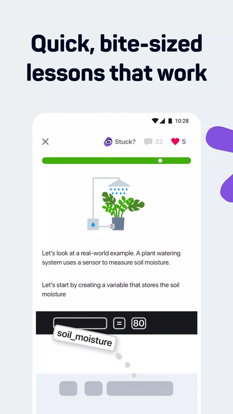 3、在我们的移动代码编辑器中编写和运行真实代码,从真实代码示例中获得启发,并在此过程中参与交互式社区对话。