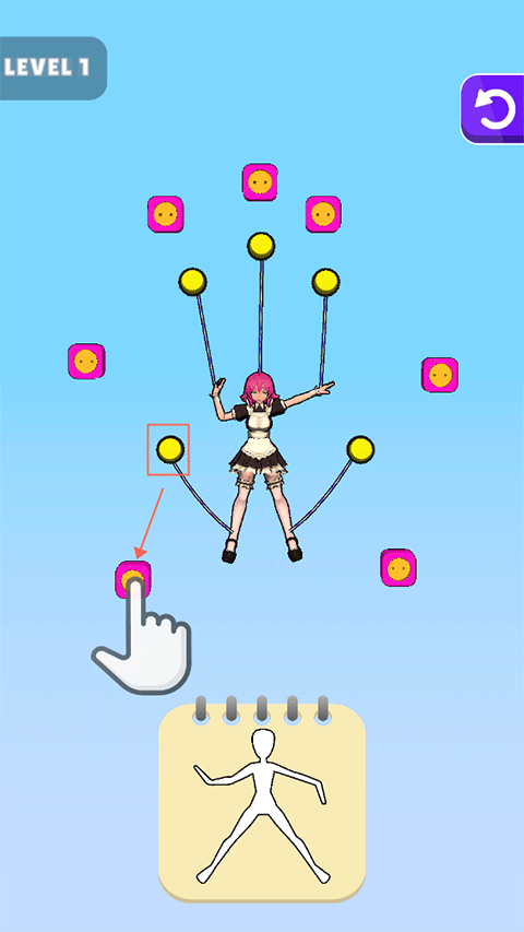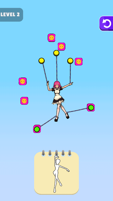 木偶大师是一款休闲闯关类游戏,玩家需要控制木偶完成各种姿势来通关。玩法很简单,只要把线连对位置就能过关,整个过程很魔性,适合用来放松心情。游戏一开始会解锁一些简单的关卡,随着进步难度慢慢增加,还能解锁更多有趣的姿势和挑战。