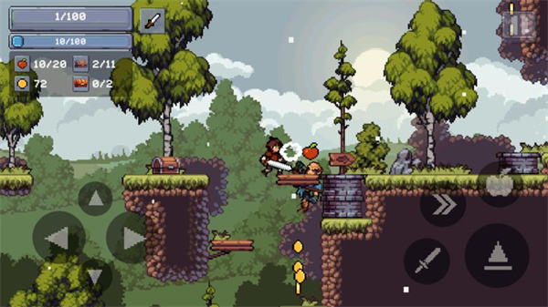 2、左边控制角色的移动,右边是攻击、冲刺、跳跃和投掷苹果。
