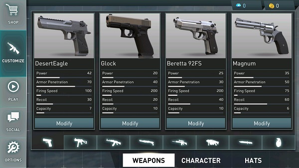 游戏里有很多武器选择,包括冲锋枪、步枪、霰弹枪、狙击枪等,还有丰富的皮肤和饰品可以解锁。界面简单易懂,商城能用金币钻石买碎片和角色。设置选项也很方便,可以调声音大小、画质和灵敏度。