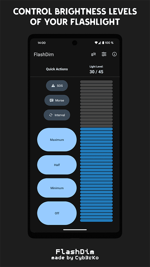 FlashDim 是一款很实用的手机工具应用,专门用来调节手机闪光灯亮度。它最大的特点就是比系统自带的手电筒功能强大很多,不仅有开关模式,还能通过滑块精确调整亮度,从微弱到最强都能轻松控制。我觉得这个设计挺贴心的,因为在晚上看地图或者找东西的时候,用低亮度既不会刺眼也不会打扰别人。