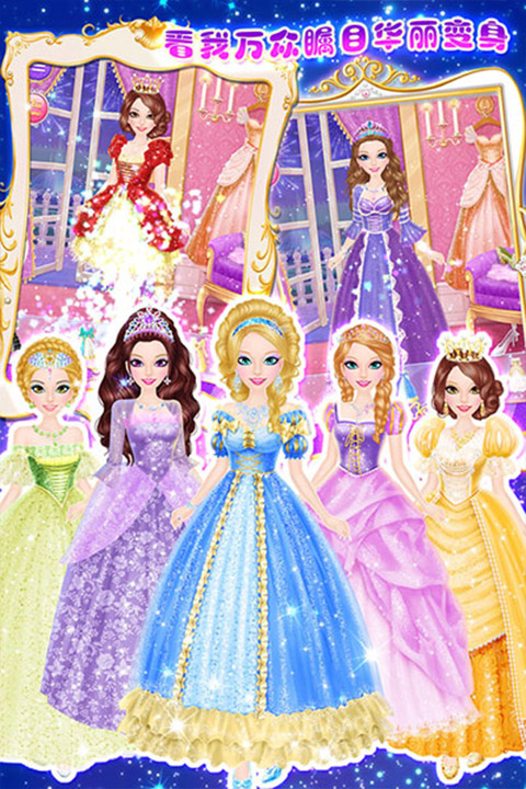 当然,美丽又善良的姑娘总会遇到奇迹!仙女教母带来了宫廷式的顶级SPA、精致的化妆品、华丽的舞会礼服,更有超级闪耀的水晶鞋。玩家是否曾幻想像灰姑娘一样浪漫又华丽的变身呢,是否期待着一场甜蜜又唯美的邂逅呢。灰姑娘沙龙游戏中场空前绝后的宫廷舞会,三位帅气迷人的王子,美丽的仙女教母,华丽的服装、水晶鞋、南瓜马车和所有的一切都将会带玩家走进童话世界,身临其境体验其中多姿多彩的美妙生活。
