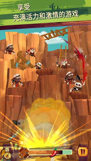 你的宝藏被敌人抢走了,于是你就开着11路踏上了追凶之旅,牛仔不应该都骑马的吗喂!游戏得像玩通常的跑酷游戏那样左右闪躲路上的障碍,还得通过点击屏幕射击周围想暗算你的敌人。击中敌人可以攒能量条,集满可召唤鹦鹉开大招。