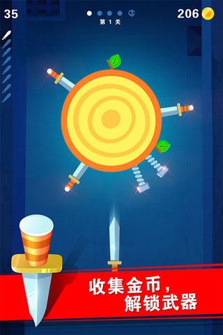2、向目标扔出飞刀并将它们击破,每五关将迎来BOSS关卡,更具挑战。获取金币兑换更多款式的飞刀。