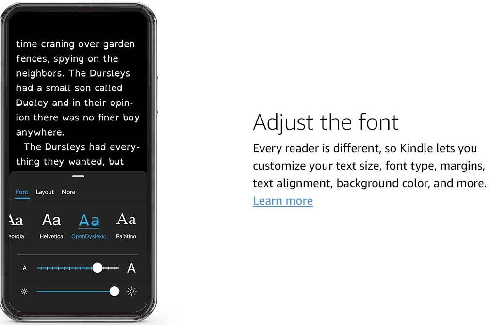 说明:每位读者的阅读习惯都不同,因此 Kindle 支持你自定义字号、字体类型、页边距、文本对齐方式、背景颜色等多项设置。