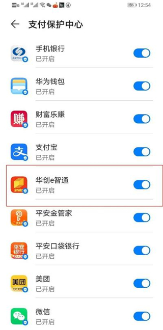 点开“支付保护中心”,在该界面找到“华创e智通”,将其后边的开关条关闭即可。如图