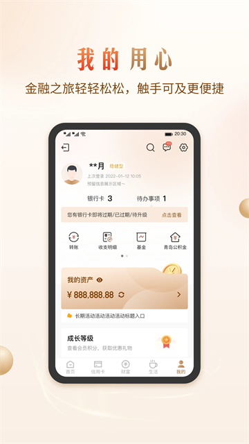 【我的】简约的设计风格、暖心的颜色搭配、一目了然的功能布局,提高交易顺畅性。新增服务指南、业务办理楼层,陪伴您的金融之旅。