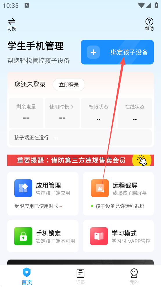 2、例如,以家长的身份登录后,需要先绑定孩子的设备。