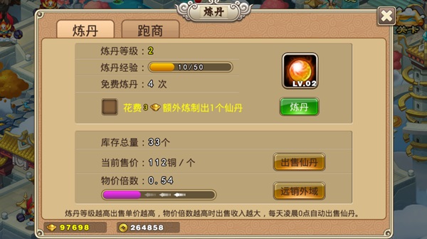 Ps:炼丹等级越高出售的价格也会相对提高,跑商获得的铜钱也是跟炼丹等级有关喔