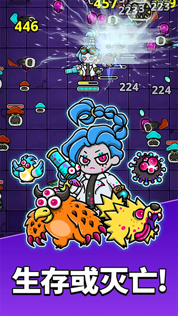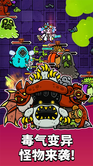 《异变生存战》是一款 Roguelike 动作生存手游,背景设定在一个被毒雾和突变体肆虐的地底世界。玩家将扮演流放的天才科学家 Zen,在这个危险重重的世界中求生。游戏玩法简单,支持单手操作和自动攻击,玩家只需负责走位和技能选择。击败敌人后会掉落紫色资源,用来购买生物或强化队伍。游戏中有丰富的怪物、随机出现的小 BOSS 和毒区等环境威胁,每次战斗体验都不同。