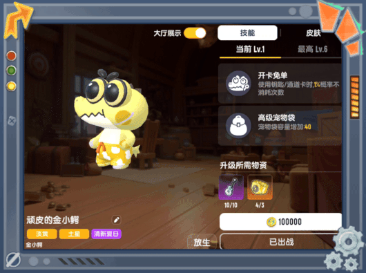 【金小鳄】将自带全新宠物技能,肠肠可消耗指定物资与肠宝币进行升级,让【金小鳄】逐步成长成为可靠的小队伙伴!