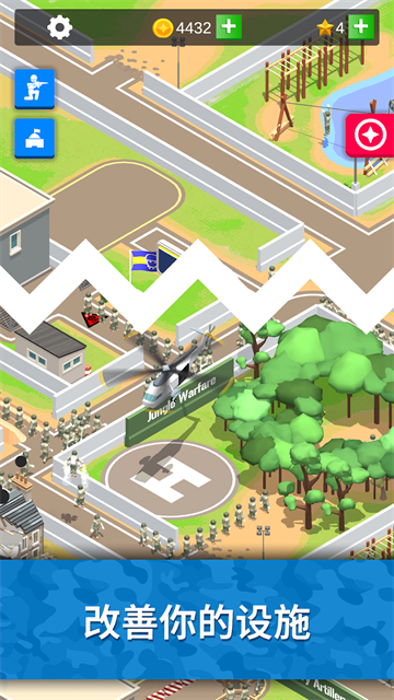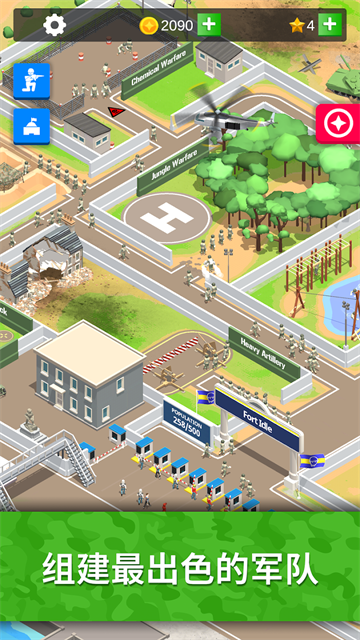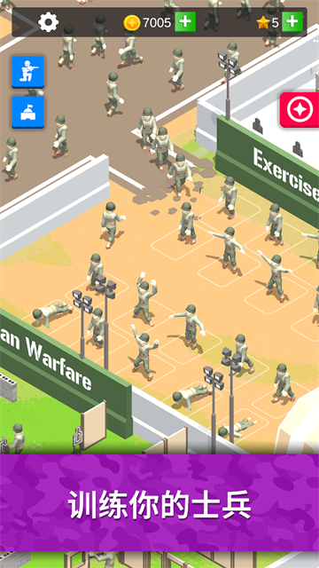闲置要塞是一款军队放置游戏,你需要做的就是创造一个世界上最伟大的军事基地,通过不断招募士兵,训练士兵,完成一系列的训练挑战,这里的每一项挑战都是非常艰难的,但是只能接受严格的训练才可以变得更强大。军事训练得到进展才可以获得金钱,金钱可以用于扩张营地和升级设施,可以升级所有训练区的数值、速度、容量和队列规模。游戏玩法丰富,各式各样的战斗模式可以给你带来更多不一样的体验,让你不会感到枯燥无聊。虽然创造的过程如同过山车般起伏跌宕,但是你一定会爱上你的军事基地。