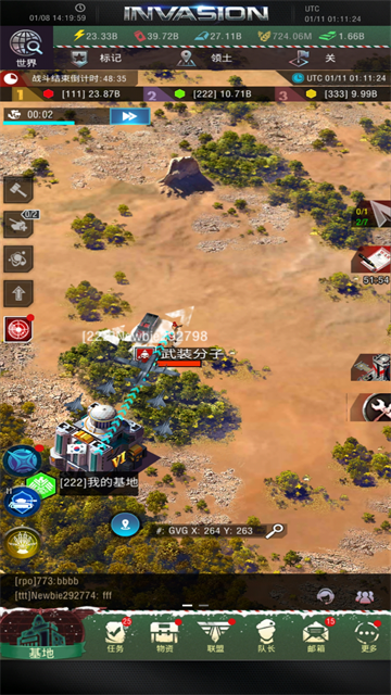 进入《战地风暴》之后,我们可以点击左下角的“地图”来进入大地图界面,在这个界面中,每个基地下方都会有玩家的角色ID,方便大家找到自己的基地,而在基地四周,我们可以看到包括能源点、麦田、油田、钢厂等许多设施,每个设施都拥有不同的坐标,玩家点击之后可以查看设施的详细信息,例如数量、采集者以及设施等级。