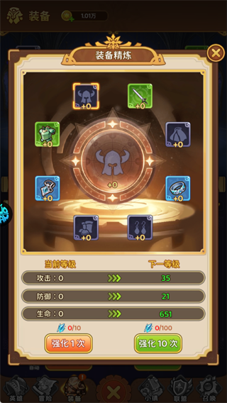 优先用资源【强化10次】全套装备,快速提升攻击、防御等属性,为推关铺路。