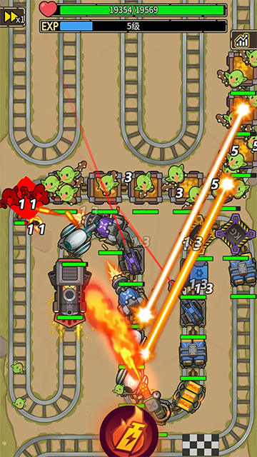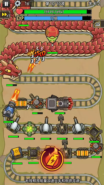 打破传统塔防的静态防御模式,火车既是炮塔的移动载体,车头还能作为攻坚武器正面撞击敌人。而且火车加速后能联动提升炮塔攻速,形成速度与火力相辅相成的对战效果,玩家需在推进和火力间做好平衡。