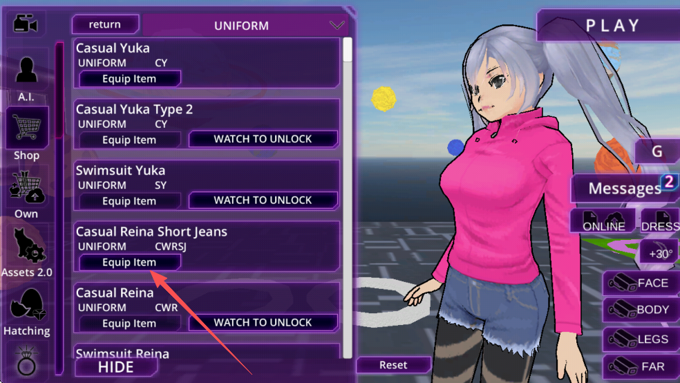 换装也很方便,打开商店选Uniform就能试穿不同风格的衣服,还能摆出各种可爱的姿势,比如害羞或者敬礼,甚至还能调整体型大小,这点设计真的很贴心。游戏里还支持求婚结婚,穿上白色婚纱的感觉一定很浪漫吧!