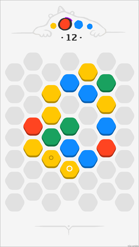 2、玩家需要将标着白色圆圈的六边形进行拖动,相同颜色的方块堆在一个位置就会合并成一个,同时得4分若5个得8分,6个好像是14分。