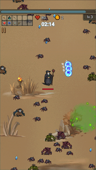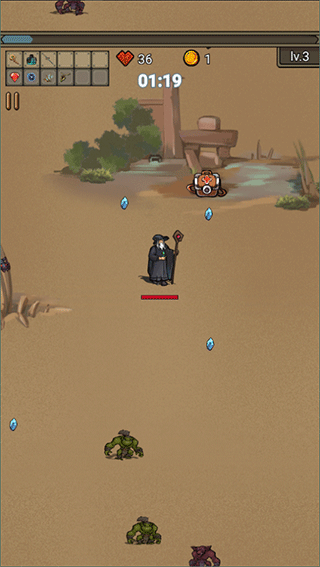 2、进入末日地图后,会有大量的小怪向你袭来,你可以点击屏幕拖动移动躲避,并拾取蓝色的宝石获得经验;