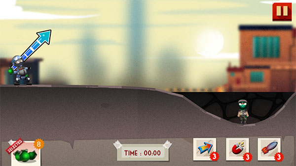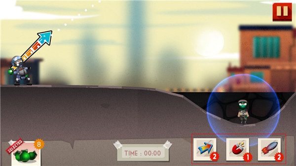2、投掷手雷,需要调整好物理角度,以获得高分和金币奖励。