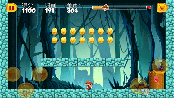 2、关卡内正常跑法,顶砖块才怪物,但是到如图的地方,可以点击向下的按钮,到达特殊奖励关卡;