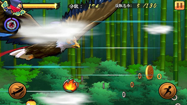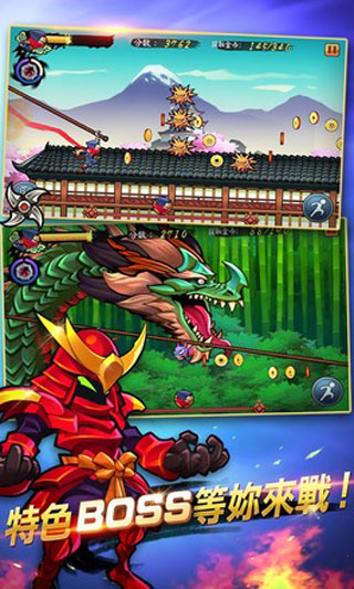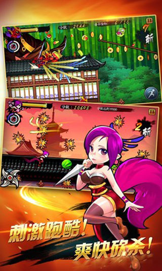 这款游戏是以忍者为主角进行的跑酷游戏。游戏中主角是一名忍着,通过杀敌,吃金币获得分数,在体力消耗完毕之前到达重点就算过关,分数越高所获得的星级就越高。这个游戏给我的感觉就是《天天酷跑》的感觉,两者玩起来大同小异。