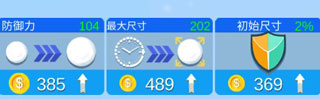 初始加成:包含防御力,最大尺寸和初始尺寸三项养成,使用金币可以得以增幅。