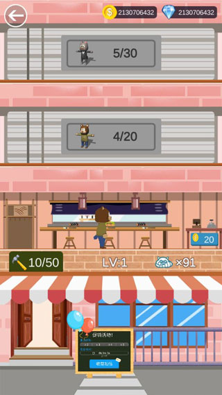 通过等待顾客的光临,待系数达成一定的积累即可升级餐厅类型增加效益,同时跑酷过程中拯救的一定动物数量还能解锁更多楼层的餐厅,从而大大增幅游戏收益。