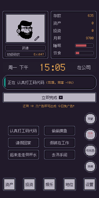 另外,在游戏码农那些打工的日子游戏中还有休息、通勤等一些劳逸结合的玩法,在家里的时候,打打游戏,看看小说,或睡睡觉,只有照顾好自己才能有更充沛的精力胜任更高强度的工作,相应的工资赚取也会越多。有钱了之后,可以通过资产的分配来优化自己的资金,也可以适当的玩一些赚钱小游戏,来充实自己的打工者生涯!种种写实的打工经历与生活模拟,还会认为它只是一款小游戏那么简单吗?如果你正是刚入职场的少年,不妨凭借该游戏写实的风格来模拟你的打工生涯吧!