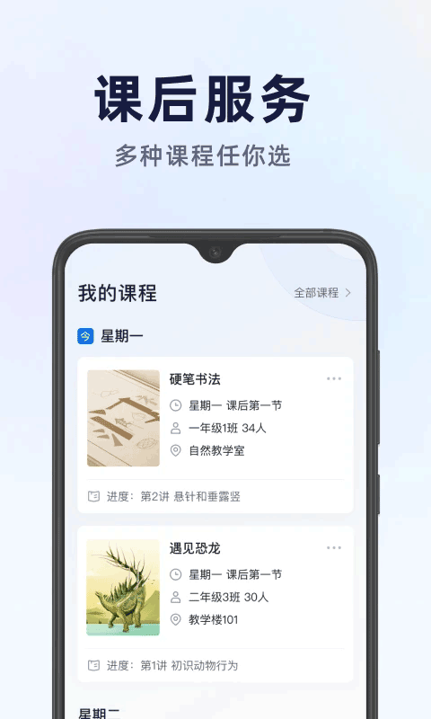 2、教师可浏览本校的全部兴趣课程,并根据自己的需求将课程添加到个人列表中,方便随时查看和管理。这一功能为教师提供了丰富的课后资源支持,帮助教师更好地规划课外活动,满足学生的多样化学习需求。