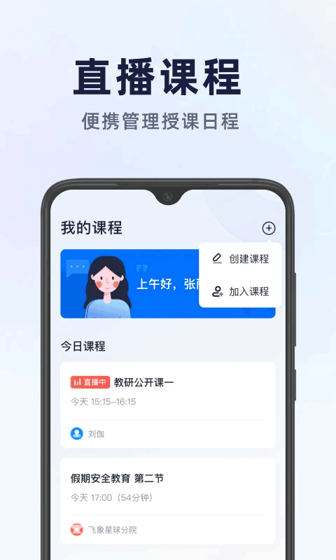 老师建立班级,邀请任课老师及学生加入班级,并在班级内发布各类通知、开设线上课程